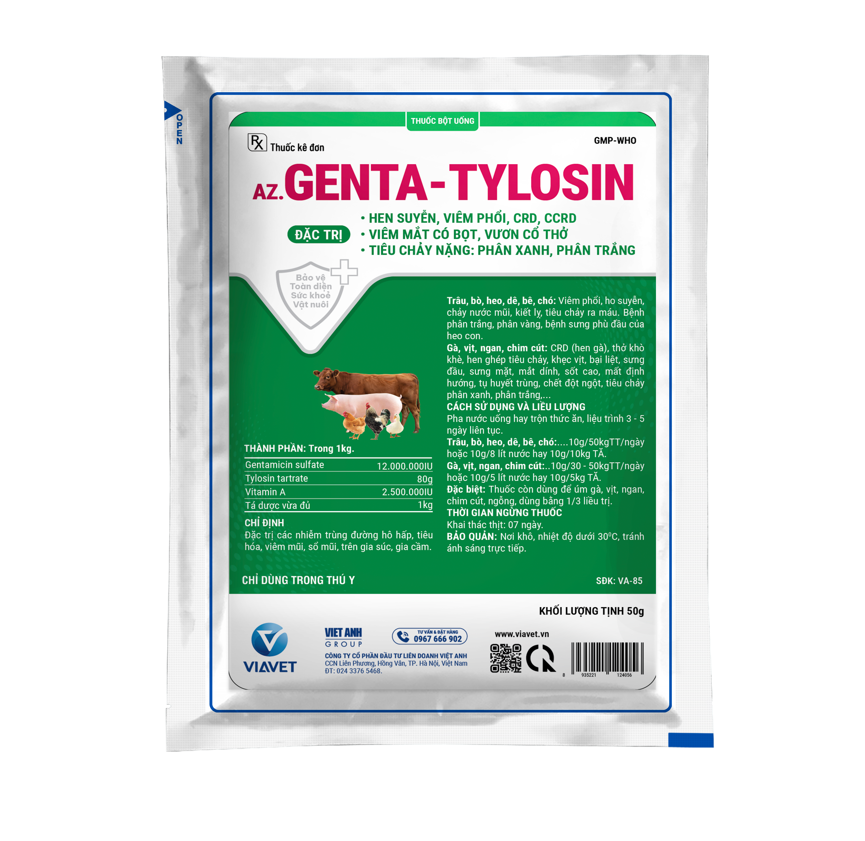 Đặc trị các nhiễm trùng đường hô hấp, tiêu hóa, viêm mũi, sổ mũi, trên gia súc, gia cầm.