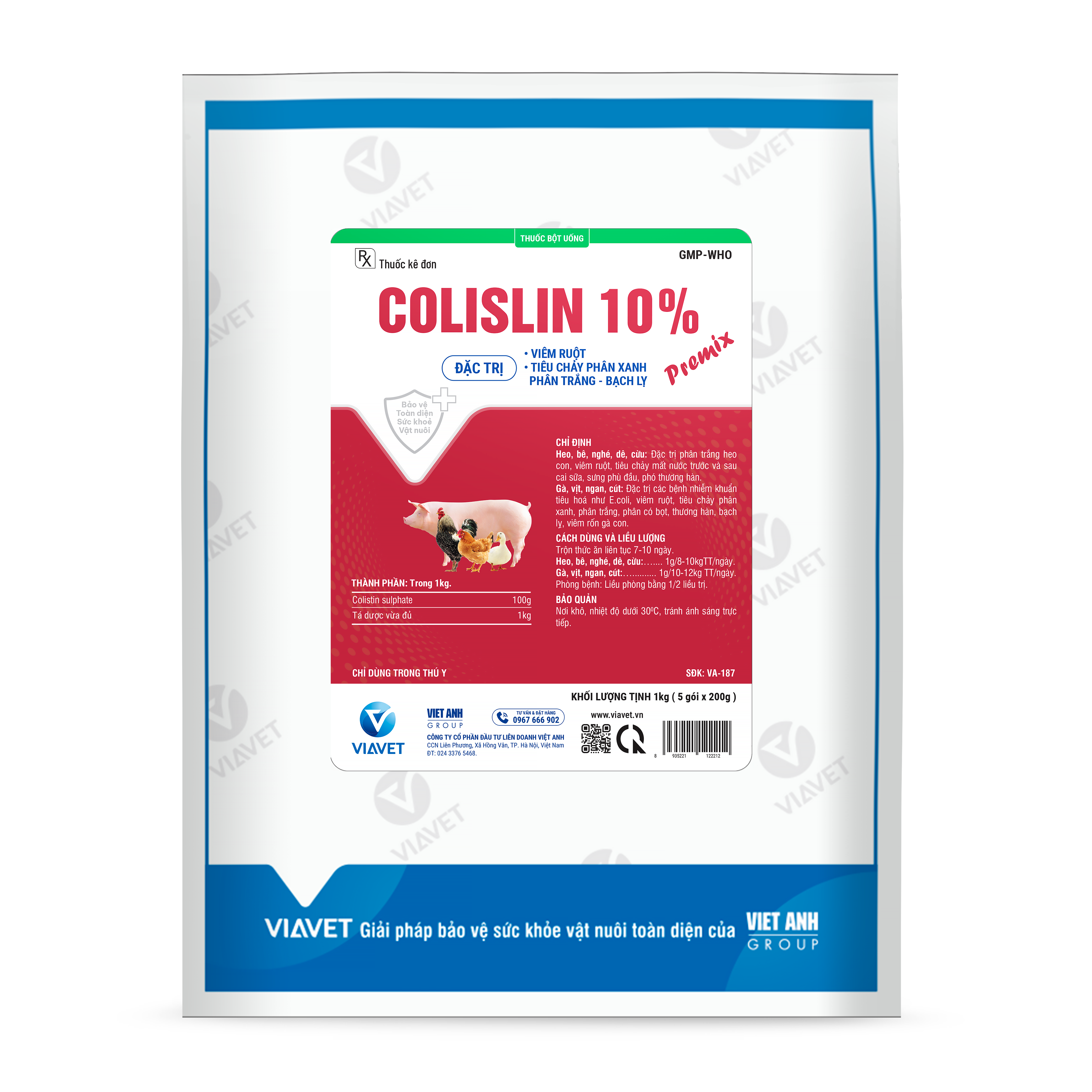 Heo, bê, nghé, dê, cừu: Đặc trị phân trắng heo con, viêm ruột, tiêu chảy mất nước trước và sau cai sữa, sưng phù đầu, phó thương hàn.