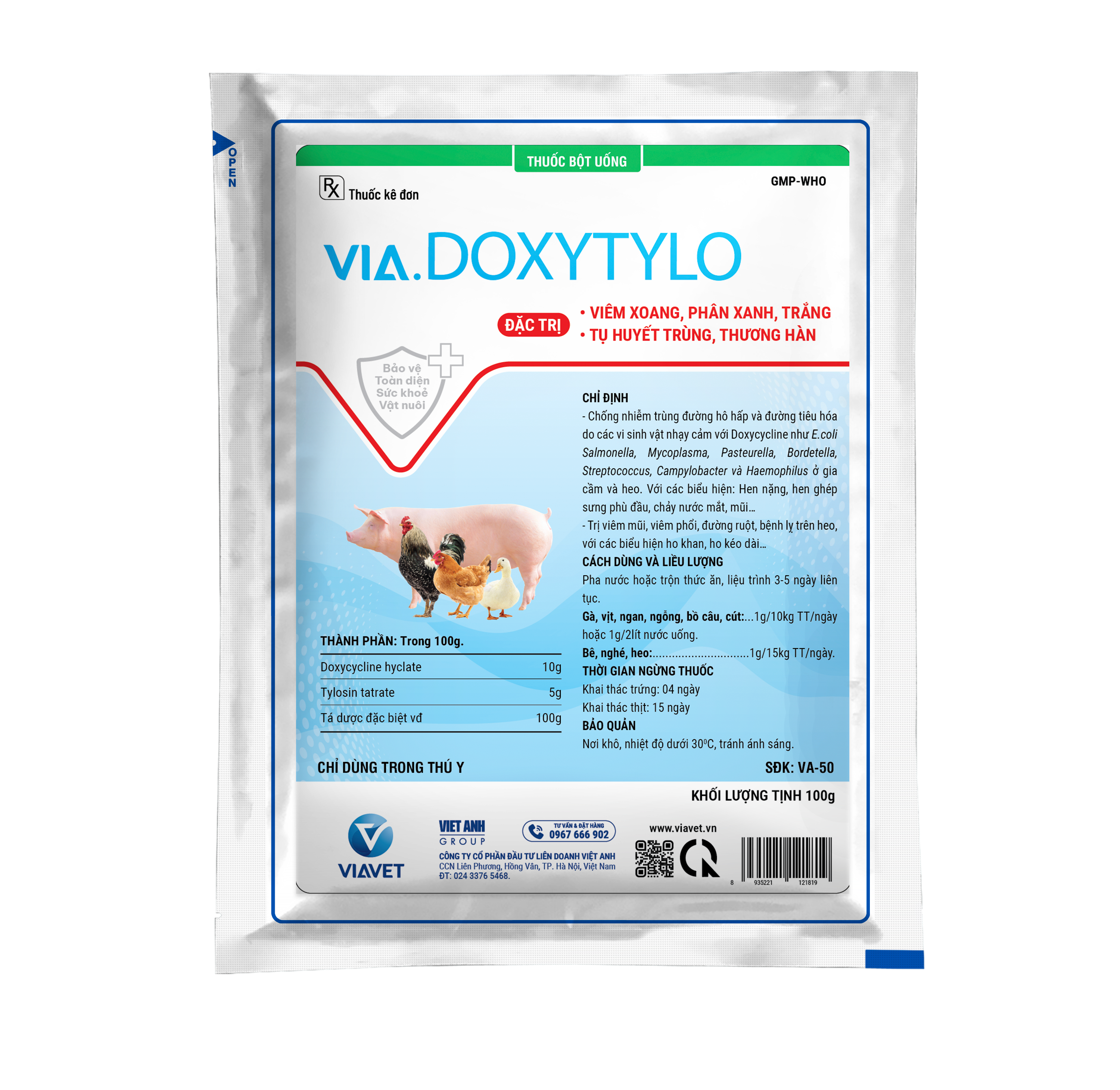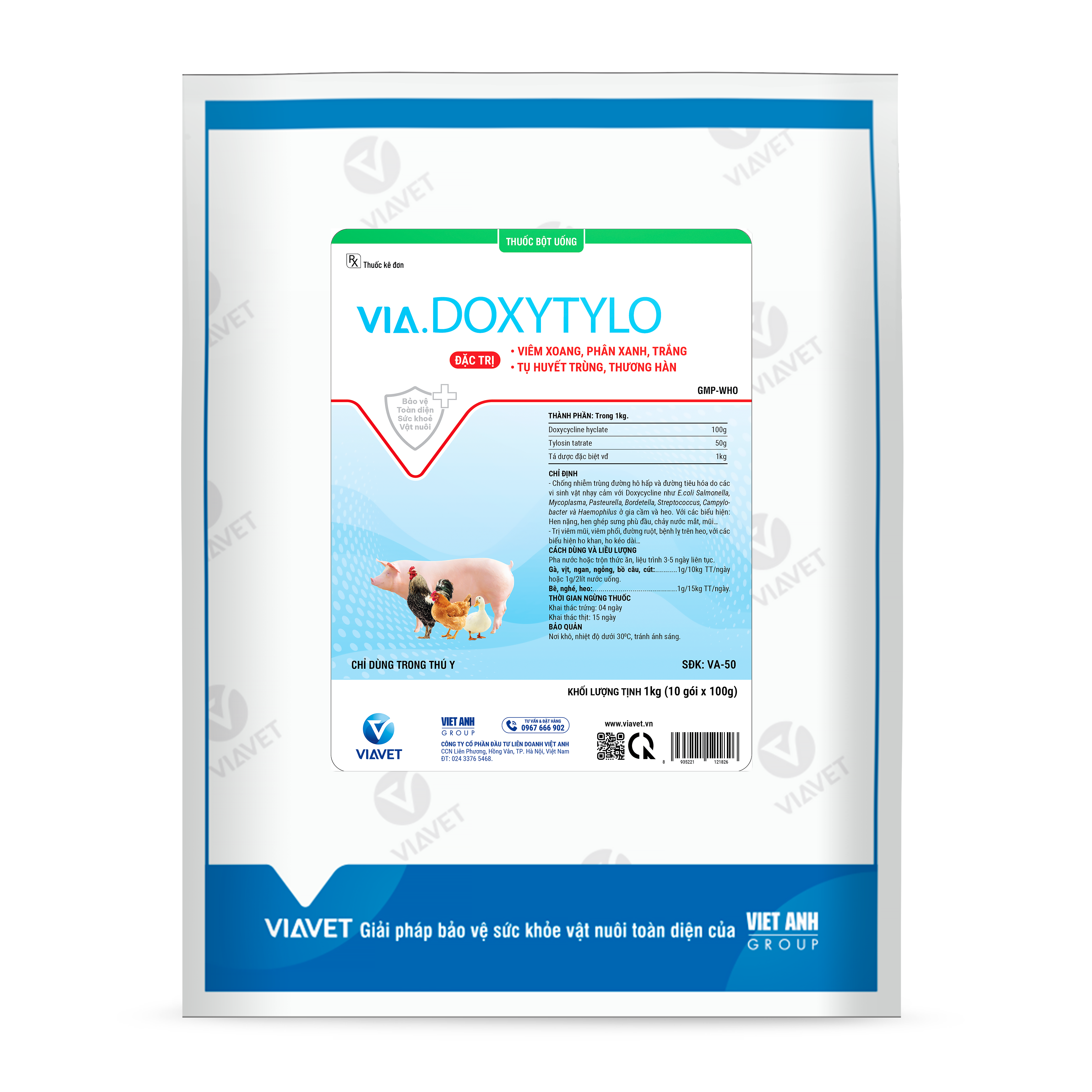– Chống nhiễm trùng đường hô hấp và đường tiêu hóa do các vi sinh vật nhạy cảm với Doxycycline như E.coli Salmonella, Mycoplasma, Pasteurella, Bordetella, Streptococcus, Campylobacter và Haemophilus ở gia cầm và heo. Với các biểu hiện: Hen nặng, hen ghép sưng phù đầu, chảy nước mắt, mũi…