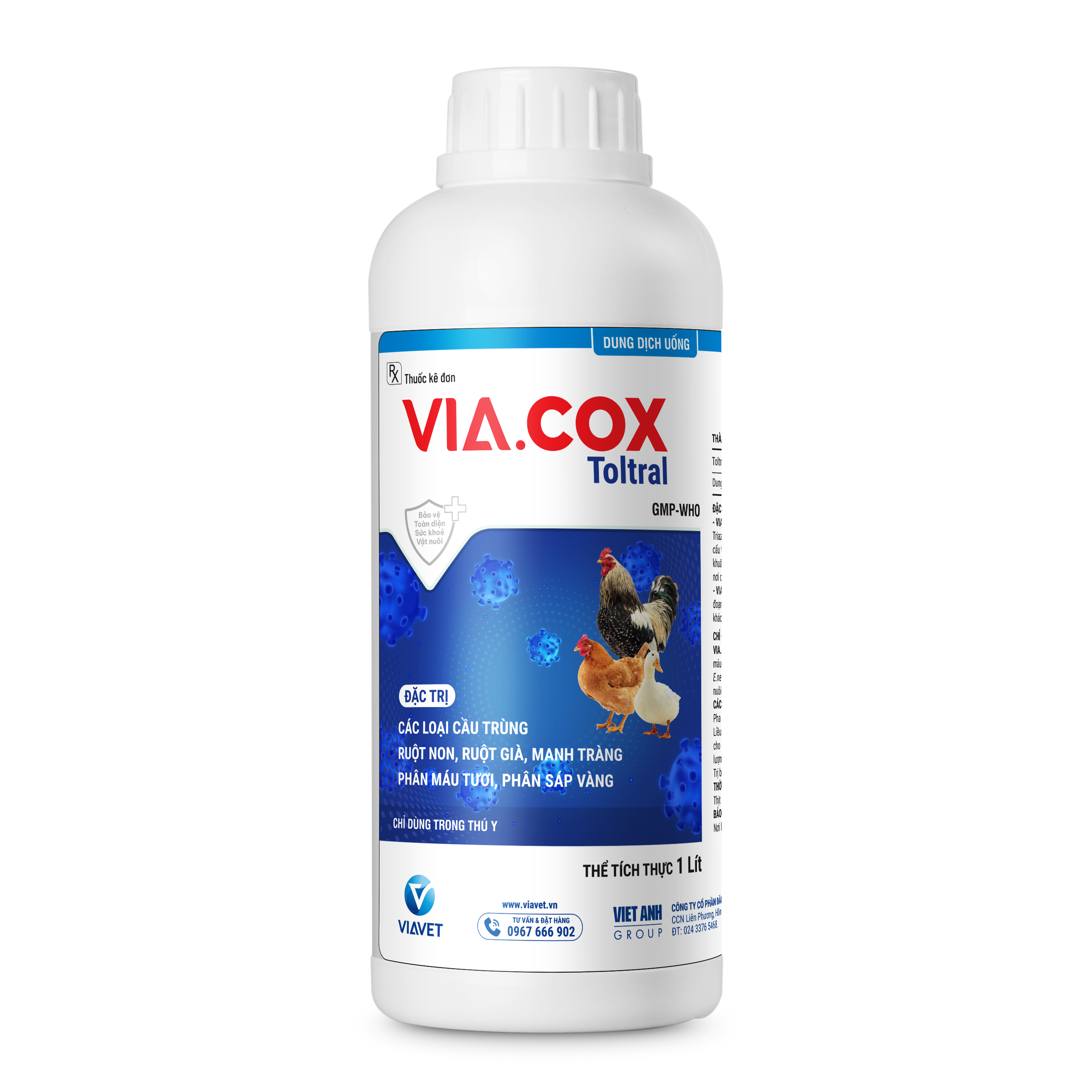 VIA.COX Toltral đặc trị bệnh cầu trùng ruột non, manh tràng tiêu chảy phân sáp lẫn máu tươi ở gia cầm gây ra bởi: E.tenella, E.necatnix, E.acervulina, E.maxima, E.brunetti….